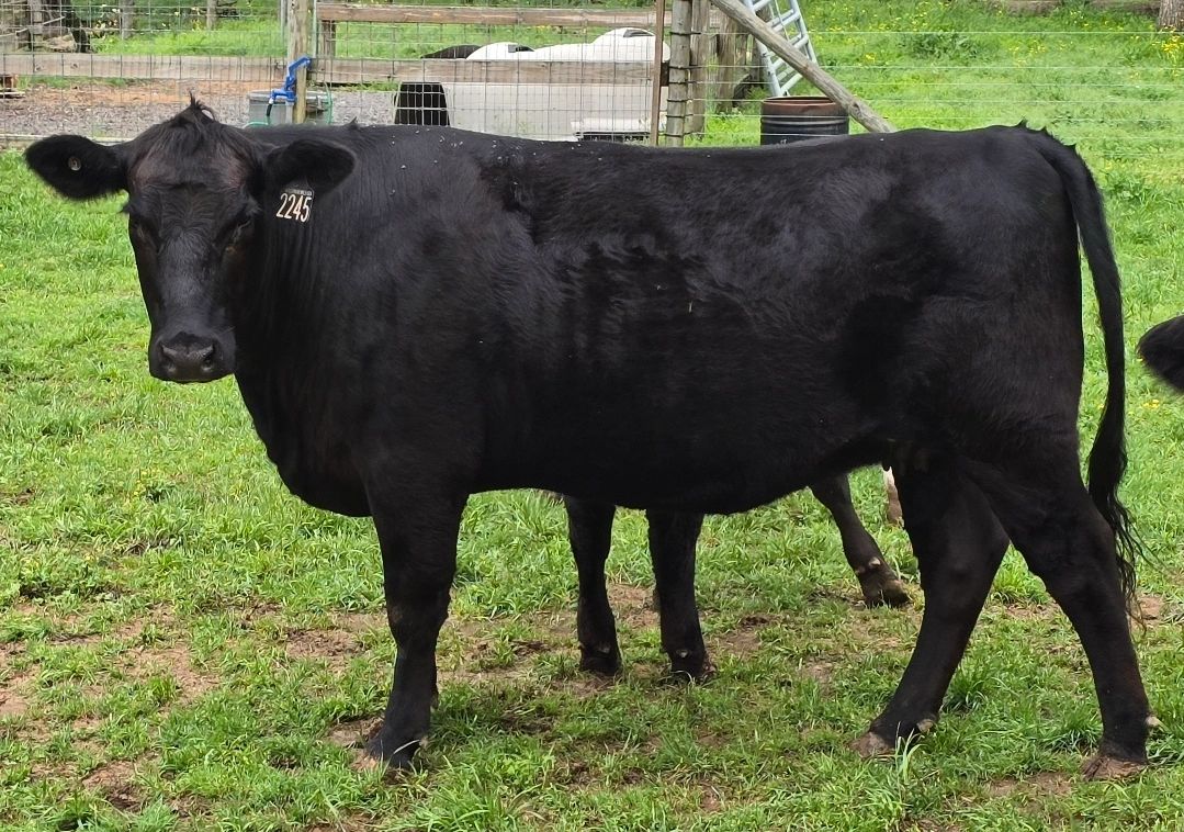 3 yo SimAngus cow. Confirmed bred to our low birth weight, homozygous black and polled SimAngus bull for a Fall calf. Kora is easy to handle, and comes to feed with no problem.